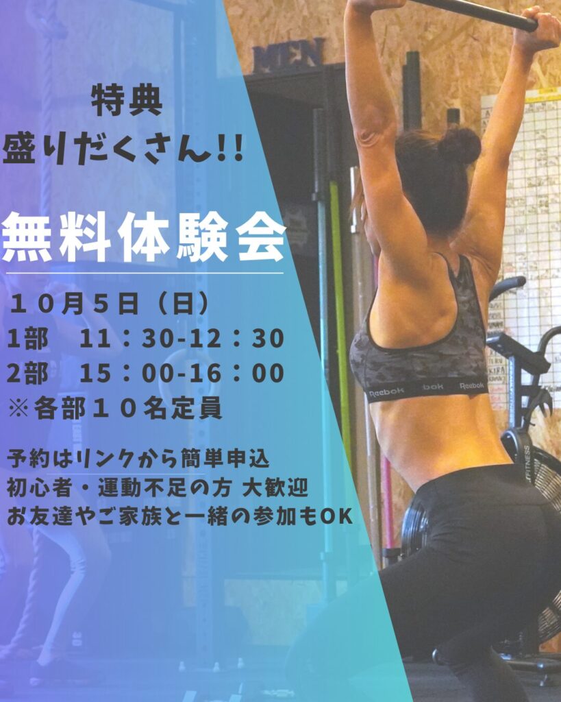 2025.09.29 NEWS 10/5(日)無料体験会実施します! 10/5(日)クロスフィットビードルで無料体験会を行います。時間帯は以下通りとなっております。1部:11:30~12:302部:15:00~16:00腕立て、腹筋、スクワットが出来ない方、屋外スポーツのオフシーズン中の運動として体を動かしたい方等是非お時間のある方、クロスフィットを体験してみてはいかがでしょうか。体験希望の方はお電話、メール、SNSからのDM等なんでもかまいませんのでご連絡いただければ幸いです。 < PREV NEWS ALL NEXT >